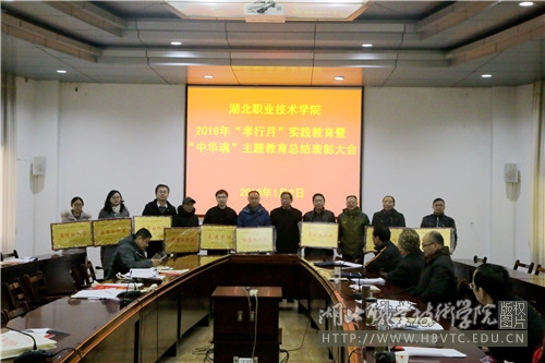 会议表彰了9个先进集体和103名优秀师生个人,学校关工委副主任、团委书记谭之平宣读了校级“校行月”实践教育活动优秀师生和先进集体、“中华魂”(腾飞的祖国——改革开放四十年)主题教育活动征文、演讲比赛优秀师生和先进集体的决定;学校关工委副主任、学工部部长沈建林宣读了孝感市“孝行月”实践教育活动表彰湖北职院最美孝德青少年、最优班主任、最好家庭、最佳“五老”志愿者的决定。杨玉萍等17人获得征文优秀组织奖:信息技术学院等3个学院获得征文先进单位奖;宋静茹等19人“中华魂”主题教育活动演讲比赛优秀个人奖:汪天柱等12人获得“中华魂”演讲比赛工作人员特别贡献奖。同时,汪天柱等11名学生获得“孝行月”最美孝德青年;胡德胜等12人获得“孝行月”最好家长;田晓军等12人获得“孝行月”最优班主任;罗义斌等8人获得“孝行月”最佳“五老”志愿者;附属医院、护理学院获得”孝行月”创新奖:师范学院、机电学院获得“孝行月”最佳组织奖。