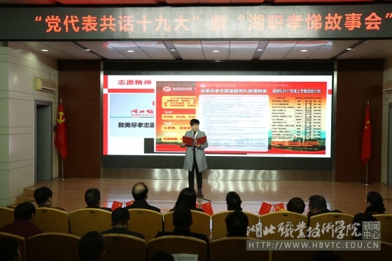 12月8日下午,学校2017年度“四季感恩”校园文化活动表彰大会暨“湖职孝悌故事会”在西校区文博馆学术报告厅顺利举行。我校优秀校友、党的十九大代表、广东省中山市公交集团党委副书记、纪委书记闫文静,孝感市委宣传部常务副部长李一三,学校党委书记蔡诗红、校长朱虹、副校长杨立明,市委宣传部理论科科长刘洪波,湖北省第十一次党代会代表许智教授,孝感市第六次党代会代表、湖北省师德先进个人杨运秀教授出席了此次活动,并为获奖代表颁奖。