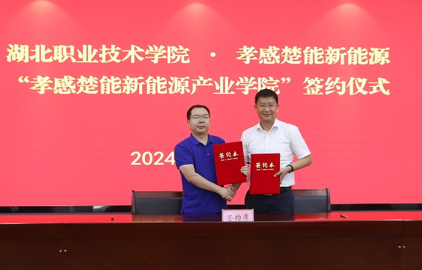 新能源产业是国家战略性新兴产业,是湖北省“51020”现代产业体系支柱产业之一。楚能新能源锂电池产业园是当前孝感市投资总量、投资强度最大、科技含量最高的工业制造项目。作为孝感市域产教联合体的重要成员,湖北职院与孝感楚能新能源合作前景广阔。郭沙与孙俊签订校企合作框架协议,邱显春、郭国文、郭沙、孙俊为“孝感楚能新能源产业学院”揭牌。