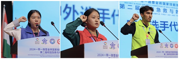 刘振英作视频致辞,并宣布大赛开幕。他强调,“一带一路”倡议为各国间的合作与发展带来了前所未有的机遇,金砖国家的合作机制也在不断深化拓展。校园急救与救护,对于打造职业教育专业特色,提升关爱生命、关注急救的社会意识具有非常重要的意义。2024年,金砖组织正式扩容至10国,金砖国家工商理事会技能发展工作组正式更名为技能发展、应用技术与创新工作组,着力聚焦技能发展与技术创新,同时将持续务实推进教随产出、校企同行,服务中国企业“走出去”,助力行业龙头企业开展海外人员学历教育和技能培训,培养国际化人才和中资企业急需的本土技能人才,打造具有中国特色的“职教出海”品牌,服务国际产能合作,为推动国际产教融合,增强中国职业教育国际影响力贡献力量。