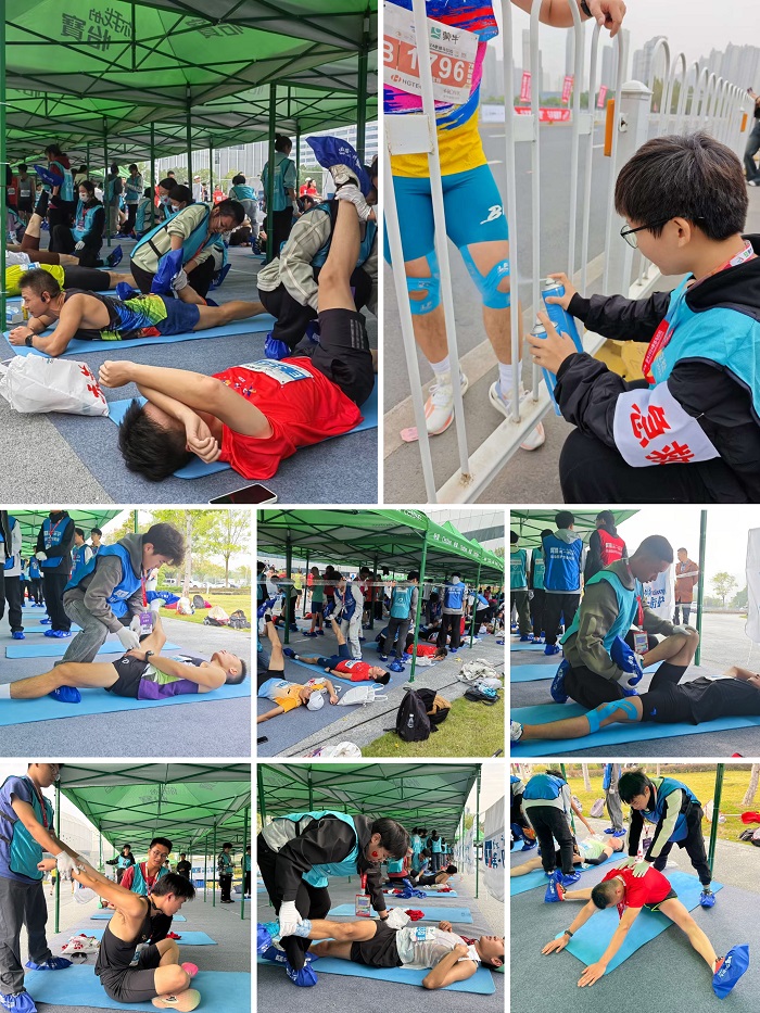 10月27日凌晨4点30分,志愿者们全部集结完毕,5点30分准时到达指定服务区域,参与保障工作。我校师生志愿者在不同的服务点,分工协作,提供补给物资、赛道指引,负责赛道沿途医疗保障、赛后拉伸,负责现场氛围营造、嘉宾接待,协助直播等,为20000名运动健儿们“护航”加油。