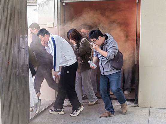 在疏散逃生演练环节,模拟会场一角发生火情,会场里瞬间烟雾弥漫,突然警报声响起。各班级安全员、单位安全管理人及教师们迅速反应,按照预定的疏散路线,用衣物捂住口鼻,弯腰低姿有序撤离。整个疏散过程紧张有序,仅用了2分钟,全体师生便安全疏散至指定集合地点,达到了预期的演练效果。