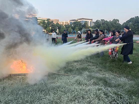 在灭火实操演练环节,孙芳教官现场演示了灭火器“提、拔、握、压”的使用方法,并详细讲解了灭火的要点,并嘱咐大家灭火时一定要站在上风或侧上风方向。师生们热情高涨,踊跃参与,逐组上前亲身体验使用灭火器扑灭明火的过程,在实践中掌握了灭火技能。