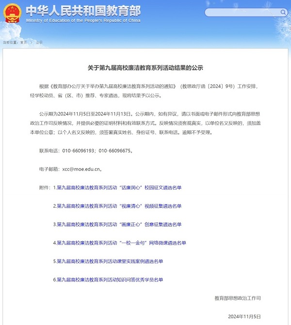 (本网讯 轩传)根据《教育部办公厅关于举办第九届高校廉洁教育系列活动的通知》(教思政厅函〔2024〕9号)工作安排,经学校动员、省(区、市)推荐、专家遴选,我校党委宣传部陈灏主持的《屈原廉洁文化》入选全国高校廉洁教育系列活动“课堂实践”案例。我校是湖北省在“课堂实践”单元唯一入选的高职院校。