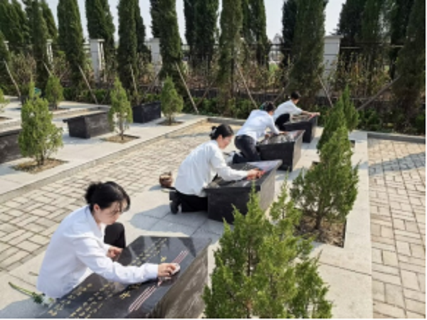 教师党员们来到烈士纪念碑前敬献菊花,朵朵白菊寄托着对英烈的无尽追思。献花仪式结束后,党员教师们手持抹布,俯身轻轻擦拭烈士墓碑。指尖拂去浮尘,目光抚过碑文,斑驳的石刻在春日阳光下愈发清晰。教师们以细致入微的行动还原英烈安息之地的洁净庄严,用无声的守护诉说“山河犹在,吾辈不忘”的承诺,将缅怀之情化作薪火相传的责任担当。