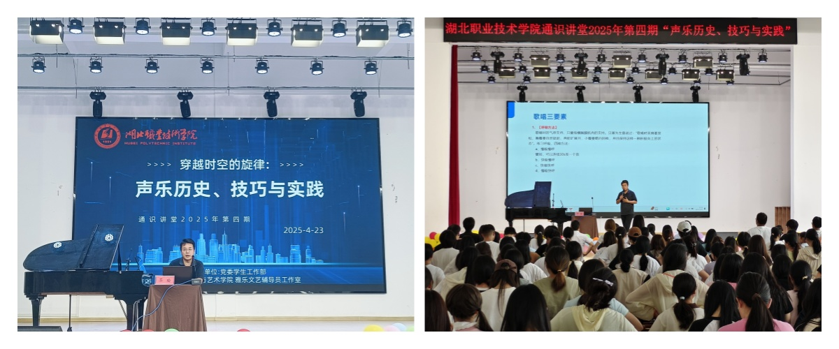 (本网讯 周小军 祝非凡)4月23日下午,由党委学生工作部主办,教育与艺术学院、雅乐文艺辅导员工作室联合承办的学校总第14期通识讲堂“穿越时空的旋律:声乐历史、技巧与实践”在九州线上平台师范校区大礼堂开讲。主讲教师苏瑜博士毕业于韩国秋溪艺术大学声乐专业、是孝感市音乐家协会会员,讲堂以“从古典到流行,探索声音的无限可能”为主线,带领300余名音乐爱好者开启了一场跨越三千年的声乐奇幻之旅。