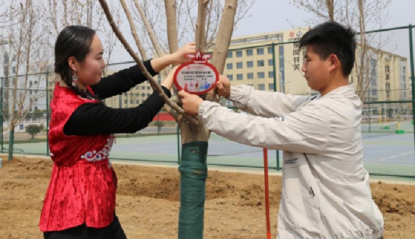 阿依舒阿克与各民族学生一道,积极参加“中华民族一家亲 携手共建团结林”义务植树活动,以结对方式认养“同心树”,做好浇水等养护工作。