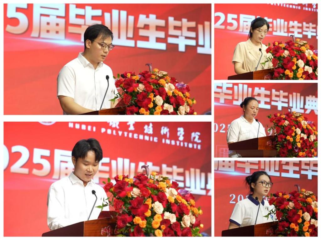 优秀毕业生代表郑美琪、优秀校友代表武汉聪明豆文化传播有限公司邹振、教师代表杨志萍、毕业生家长代表秦海红、合作企业代表中国电子系统技术有限公司潘毅杰依次发言。