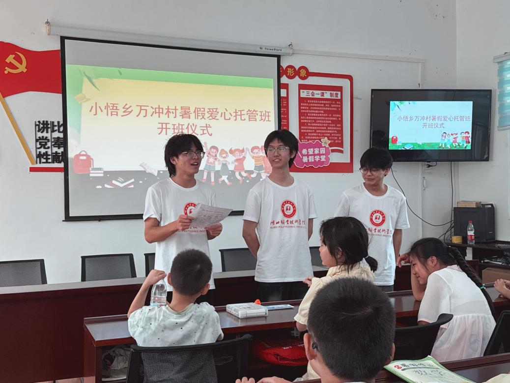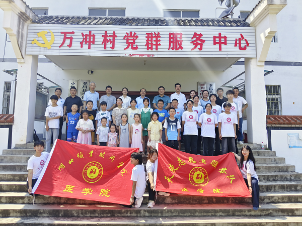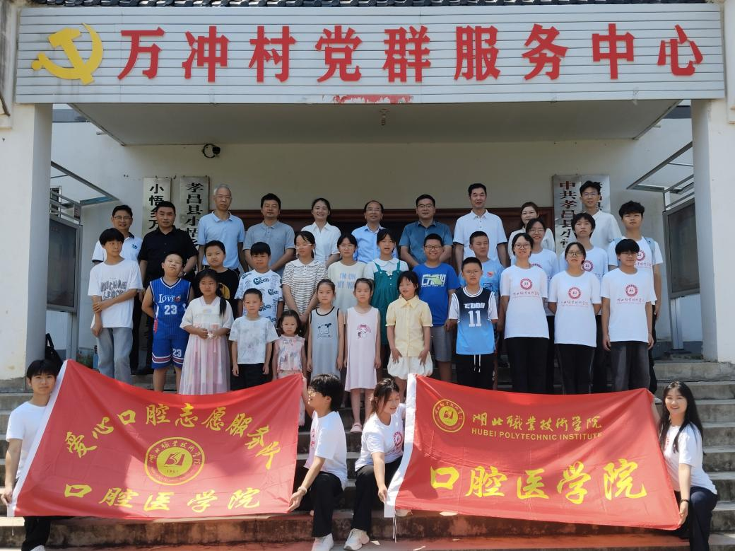 (本网讯 彭裕刚 邓彬新 刘冠儒 )7月7日,孝昌县小悟乡万冲村党员群众服务中心彩旗飘扬、笑语盈盈,我校医学院、口腔医学院携手孝昌县团委、小悟乡党委政府、万冲村村委会共同举办的暑期“爱心托管”开班仪式举行。医学院党总支书记高想清、口腔医学院党总支书记周建平,共青团孝昌县委书记宁莎莉,小悟乡党委书记徐宝传,党委副书记、乡长蔡浩泽出席开班仪式。湖北职院驻孝昌县小悟乡万冲村第一书记高俊强、医学院副院长王光耀、口腔医学院副院长张玮、医学院团委书记邓彬新、党政办相关人员、志愿者等参加活动。开班仪式由高俊强主持。