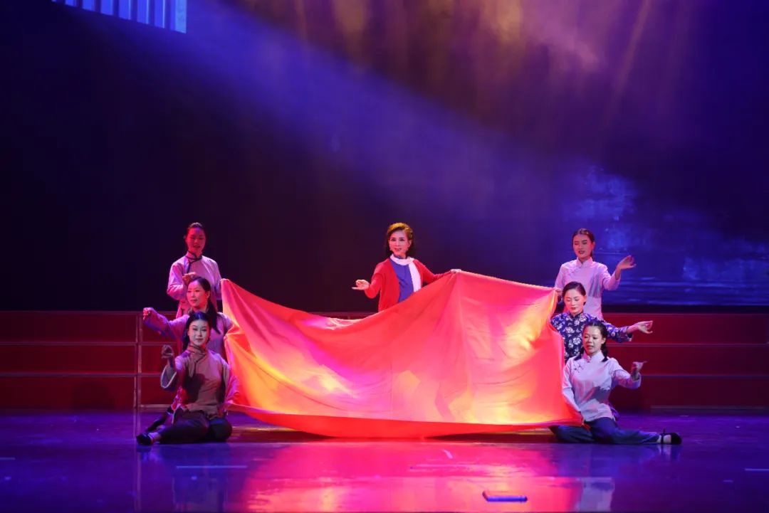 舞台上光影变幻,《洪湖赤卫队》经典场景重现。“洪湖赤卫队民兵连”、“贺英女子民兵连”、“民兵南水北调守井连”等10面旗帜在旗手护卫下依次入场,旗手们步伐铿锵,呐喊声响彻会场,与历史影像中的枪炮声形成奇妙呼应。