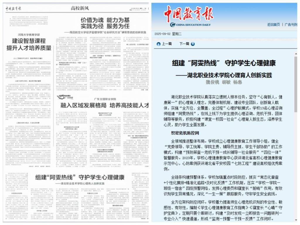 构建浸润式校园生态。学校实施“‘五育’润心”工程,培育“一院一品”特色项目,举办心理情景剧大赛、趣味心理运动会、艺术疗愈体验坊等活动,营造积极健康的校园心理文化氛围。微电影《一秒》获得湖北省第八届大学生艺术节优秀美术作品二等奖。