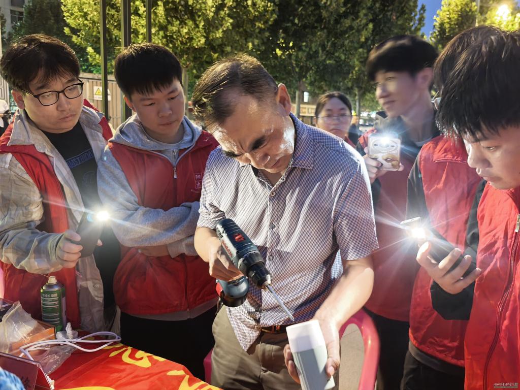 “我家这个电风扇用了好几年,突然不转了,扔了可惜,修又找不到地方,真是麻烦!” 活动刚开场,社区居民张阿姨就抱着一台旧电风扇赶来求助。机电工程学院的师生志愿者立刻接过家电,拿出万用表、螺丝刀等专业工具,分工协作开展检测。有的检查电路连接,有的拆解部件排查故障,有的记录问题原因。