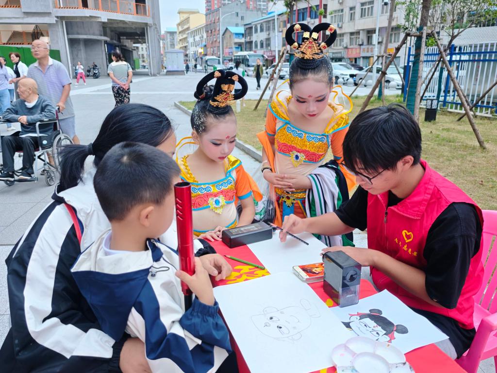 “这把扇子上画的荷花真好看!我能要这一把吗?”在建筑工程学院的漆扇创作专区,色彩斑斓的漆扇吸引了大批居民驻足。师生志愿者们以传统文化为灵感,结合现代审美,在白色扇面上精心绘制图案。有的勾勒出淡雅的梅兰竹菊,有的描绘出灵动的山水风景,有的则设计成卡通形象,每一把扇子都独一无二。