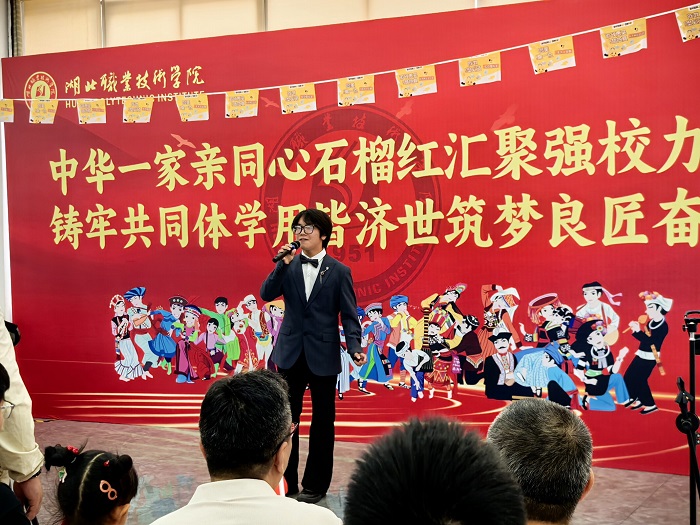 校文昌诗社、晨曦民族交流协会、2024级黄思禹同学说:“红色基因融国庆,文化非遗入中秋,我们相聚在一起,同唱一支歌,共跳一支舞,湖北职院是我们共同的精神家园,我们将牢记习近平总书记考察湖北亲临孝感时的重要讲话精神,铸牢中华民族共同体意识,打造湖北职院铸牢共同体实践高地。”