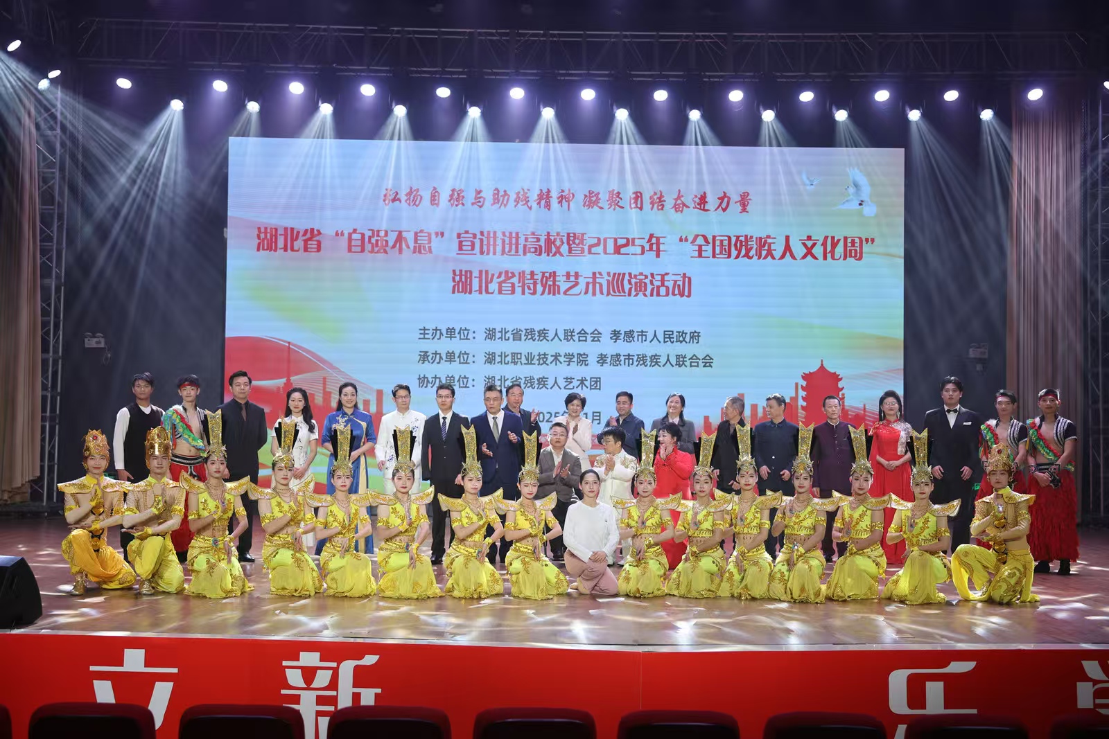 孝感天下,情润山水。此次活动由省残联、孝感市政府主办,九州线上平台、孝感市残联承办,湖北省残疾人艺术团协办。市政府残工委成员单位负责人,各县(市、区)政府、市直“三区”管委会分管负责人,残联系统干部、残疾人代表、助残志愿者代表,我校各职能部门、教学院负责人,师生代表聆听宣讲、观看演出。我校志愿者为活动提供服务。这场生动的“大思政课”,是我校思政工作的生动教材,各教学院作为班级班会主题展开学习讨论,广大学子内化于心、实践于行,向阳而生、自强不息,热爱生活、向上向善,技能报国、绽放光芒!