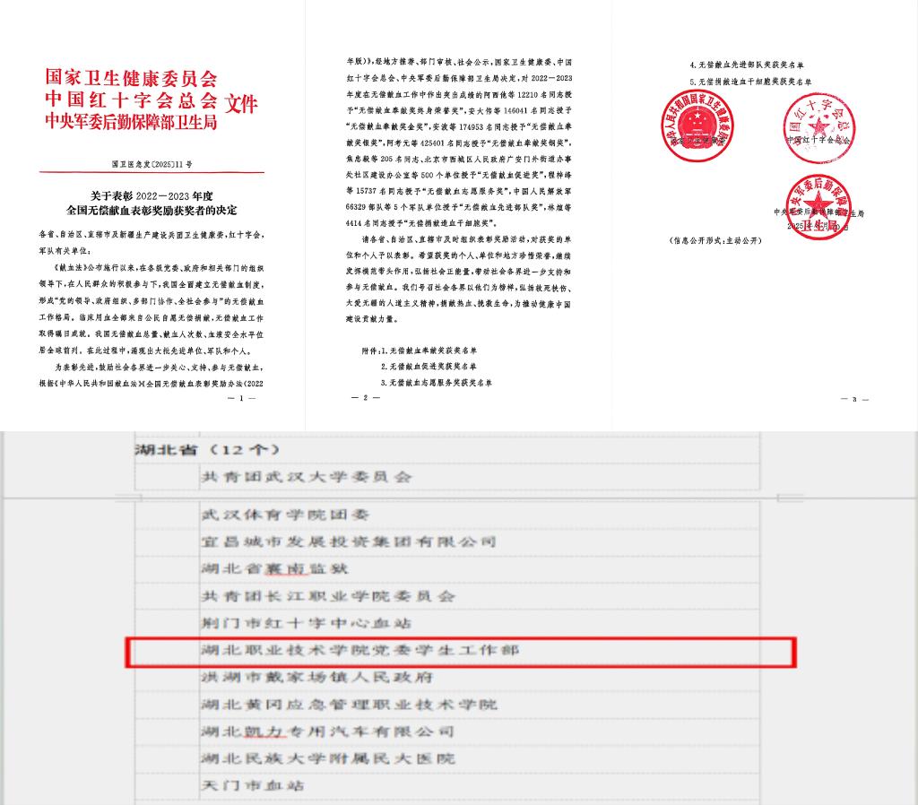 (本网讯 王欣怡)近日,国家卫生健康委、中国红十字会总会、中央军委后勤保障部卫生局联合下发表彰通报,对2022-2023年度在全国无偿献血工作中表现突出的先进单位与个人予以隆重表彰,我校凭借在无偿献血公益事业中的扎实举措与显著成效,获评“全国无偿献血促进奖”。这一国家级荣誉是对无偿献血工作的最高级别认可,彰显了我校在引导青年学子践行公益、传递大爱方面的示范引领作用,标志着学校无偿献血工作已跻身全国高校前列。