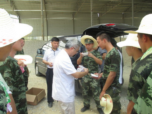 7月27日,学校附属惠济医院负责人孙国运带领皮肤专家余念文等一行八人,来到孝感临空经济开发区开展送医送药义诊活动,为受灾群众、抗洪部队官兵送去了贴心的关怀。医疗服务队先后来到闵集中学灾民安置点、闵集小学某铁甲旅驻地、马溪小学省武警总队驻地,为200多名群众、500多名抗洪部队官兵开展了皮肤病的诊疗、咨询和宣传等工作,累计发放皮肤外用药品1000余瓶支,口服药品200余盒。