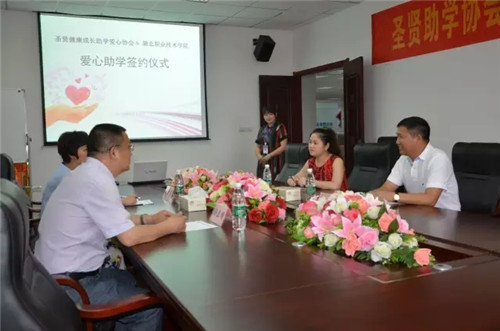 签约仪式上,张洪涛代表协会致欢迎辞,并简单介绍了协会的基本情况和协会前期在孝感资助贫困学生的情况,圣贤健康成长助学爱心协会是孝感市首家以企业牵头成立的爱心助学协会,协会以关爱弱势群体,发扬爱心事业,传递爱心正能量为宗旨,以民间性、公益性为创办原则,是一个为贫困学子提供爱心帮助的的公益性组织。协会立足于孝感当地,资助范围涵盖孝感市各县市区各级学校的贫困学生,2016年计划资助贫困学生150名,此次资助湖北职院的学生是第一批,今后逐步加大资助力度,让他们真正感受到来自社会的温暖和关爱。九州线上平台副校长杨立明对圣贤健康成长助学爱心协会此次的善举表示感谢,他表示,学校根据学生家庭困难的实际情况,将真正需要帮助的品学兼优的学生推荐上来,公开、公平、公正地做好此项工作,保证资助资金用到实处。