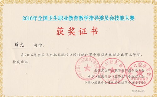 6月25日至26日,由全国卫生职业教育教学指导委员会、中华口腔医学会共同主办的2016年全国卫生职业院校口腔技能大赛在厦门医学院隆重举行。来自全国70多所本专科院校300多名选手参加了比赛。我校选派了医学院4名选手参加了牙体制备、雕牙与排牙二个项目比赛,经过两天激烈的角逐,韩宗奇、薛亢两位同学均获得了牙体制备组三等奖的好成绩。