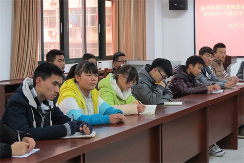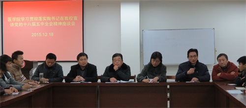 学校副校长梅重在总结时强调,医学院要将学习贯彻十八届五中全会精神作为当前一项重要的政治任务,通过专题讨论、座谈会、报告会、班会、主题团日等多种形式认真组织学习领会全会精神,在全体党员、教师和学生要做到全覆盖,掀起学习热潮,进一步深化对五中全会精神的理解和认识。希望全体师生要自觉学习领会全会提出的一系列新理念、新思路、新举措,主动当好宣讲员,并把十八届五中全会精神的学习领悟运用到实际工作和发展之中,为卫生职业教育转型发展贡献智慧和力量。