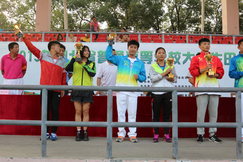 本次比赛分为甲、乙、丙三组,我校派出18名运动员参加了丙组(共33所高职高专院校)的比赛。经过三天紧张的角逐,我校共获得1金(女子100m栏)、4银(男子跳高、女子400m栏、男子400m、男子4×100m)、4铜(女子1500m、女子100m、女子4×100m、女子4×400m)以及团体总分第四、女子团体总分第三、男子团体总分第五的好成绩,并获得体育道德风尚奖。