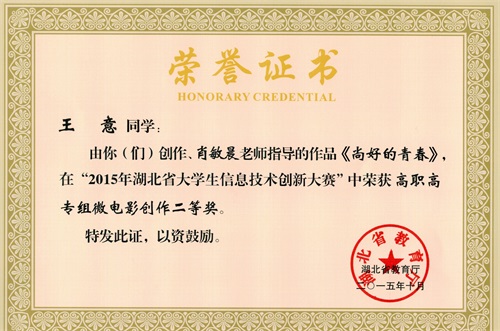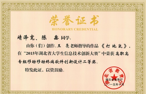 10月27日,2015年湖北省大学生信息技术创新大赛评选结果揭晓,我校选送的作品获二等奖2项、三等奖2项。其中,物流学院学生王意创作、肖敏晨老师指导的微电影《尚好的青春》,信息技术学院学生靖泽宽、陈鑫设计、王亮老师指导的移动终端软件创新设计作品《打地鼠》分别荣获二等奖;汽车学院学生朱诗磊创作、周宇恒老师指导的FLASH动画短片《新春》,护理学院学生李飞飞、蒋玲珑创作、李弘华老师指导的微电影《在路上》分别荣获三等奖。