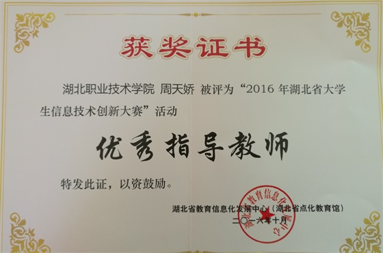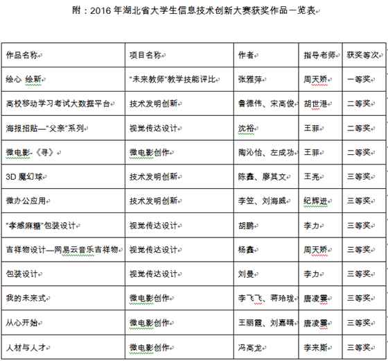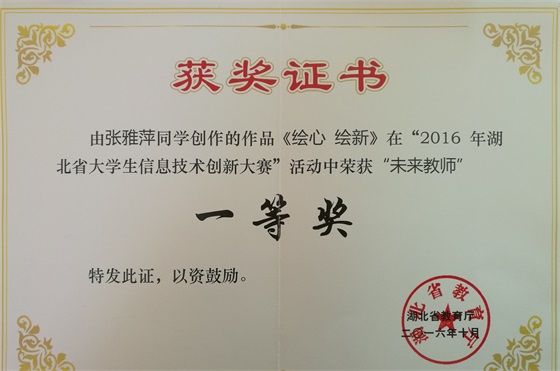近日,2016年湖北省大学生信息技术创新大赛结果揭晓,我校选送的作品获一等奖1项、二等奖3项、三等奖8项,创历史最好成绩。其中艺术与传媒学院张雅萍同学创作、周天娇老师指导的“未来老师”作品《绘心绘新》获一等奖,周天娇获“优秀指导教师”荣誉称号,该作品将代表湖北省参加下阶段的全国大学生信息技术创新大赛。