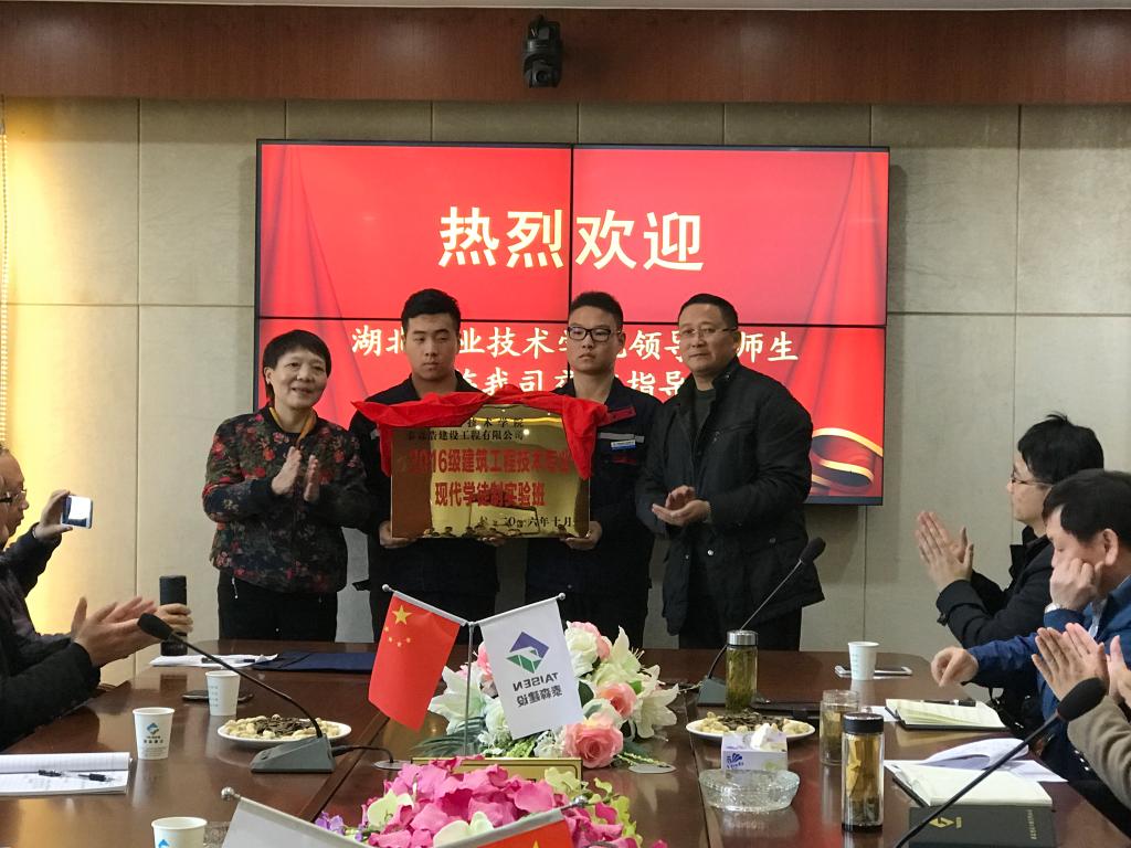 揭牌仪式上,建筑技术学院负责人黄享苟介绍了实验班的实验背景、实验基础、实验目的、实验方式、实验重点和保障措施,实验班的师傅代表秦如彪、学徒代表吴家辉作了表态性发言。揭牌仪式后,实验班的37名学徒分组参观了公司总部和汉口北工程项目部,进行了专业认知实习。