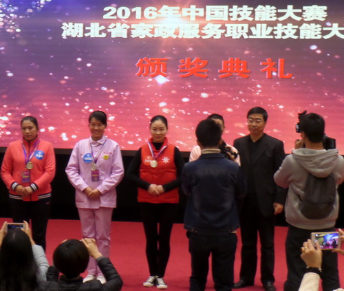 11月8日至9日,2016年中国技能大赛湖北省家政服务职业技能大赛在武汉举行,经层层选拔,来自湖北省17个市州的60名选手经职业素质、基础理论、实际操作三部分考核,15名选手进入养老护理、育婴、家务料理三个项目决赛。中华孝道创业园家政员、中华孝道创业园志愿服务队副主席、护理学院护理专业邹雨薇进入决赛,荣获湖北省家政服务职业技能大赛养老护理银牌,邹雨薇被授予“湖北省技术能手”、“湖北省巾帼建功标兵”称号。我校校长助理田寿永、孝感市妇联负责人,以及学校护理学院、中华孝道创业园等相关同志出席了湖北省家政服务职业技能大赛,孝感市获得优秀组织奖。