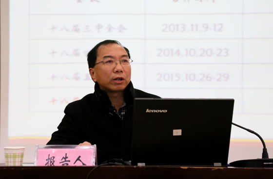 会上,李新安教授重点从党的十八届六中全会的重大意义和历史贡献、坚定不移推进全面从严治党、坚决拥护以习近平同志为核心的党中央、《准则》及《条例》的精神和要求、全面推进党中央的各项决策部署等五个方面进行了深入解读,深刻分析了全面从严治党的背景意义和战略思想,全面阐述了确立以习近平同志为核心的党中央的内涵和及重大意义。并结合《准则》、《条例》系统阐述了加强和规范党内政治生活、加强党内监督的主要内容和基本要求,对领导干部如何做到示范表率提出了自己的见解。