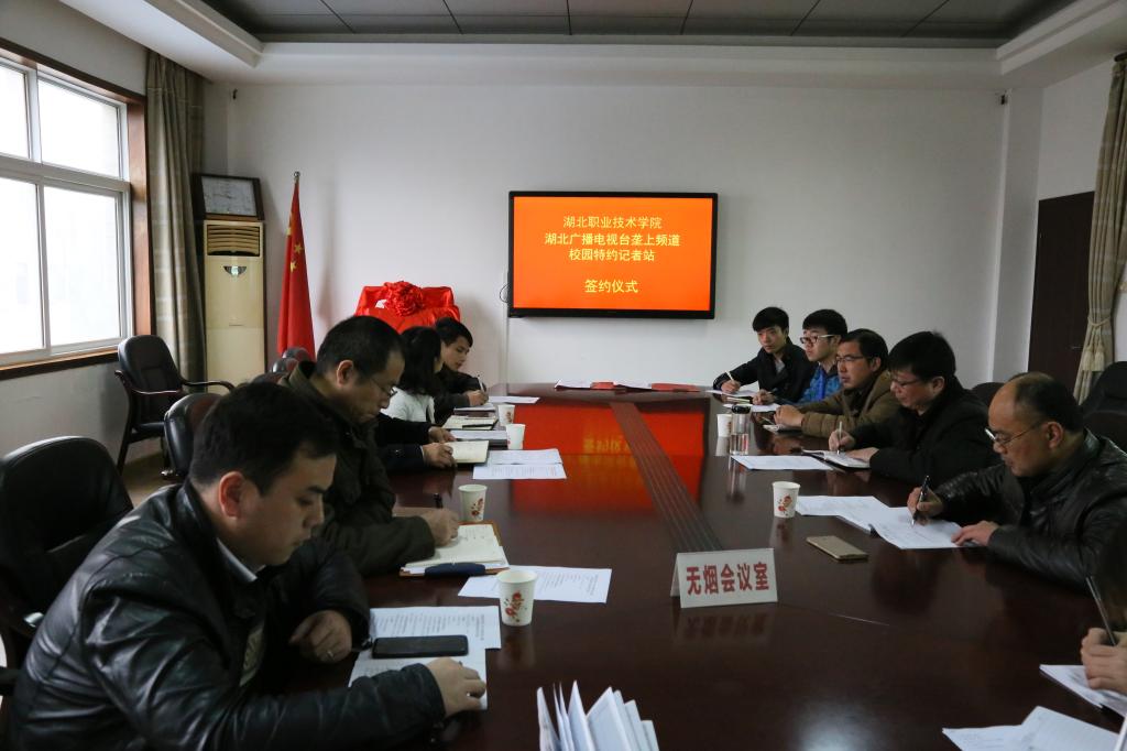 12月21日上午,湖北广播电视台垄上频道驻九州线上平台特约记者站揭牌仪式在行政楼301会议室举行。湖北长江垄上传媒集团总经理丁小平、垄上频道融媒体信息中心主任王玉珩、《打工服务社》总制片人湖北垄上人力总经理胡安龙、《打工服务社》执行制片人湖北垄上人力运营总监刘友智,学校党委副书记张勇、党委宣传部负责人曾少武、教师代表王非、校园特约记者代表等出席仪式。揭牌仪式由曾少武主持。