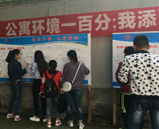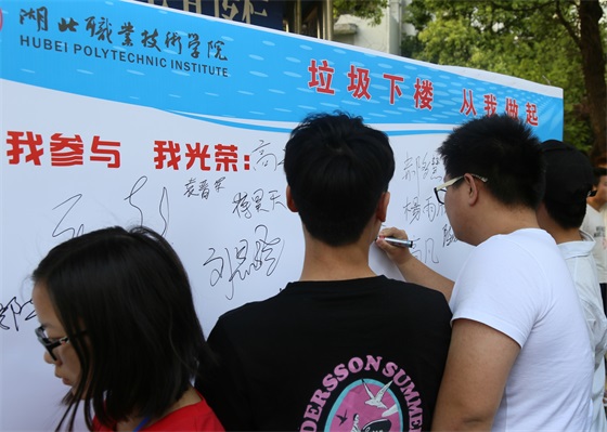 活动现场,同学们积极响应、踊跃参与,学生宿舍管理委员会成员热情地介绍本次活动的内容及意义,同学们开心地在倡议书旁的宣传栏“我承诺、我参与、我光荣”下郑重的签名,并大声宣读“垃圾下楼,从我做起”“我为文明代言”等口号。