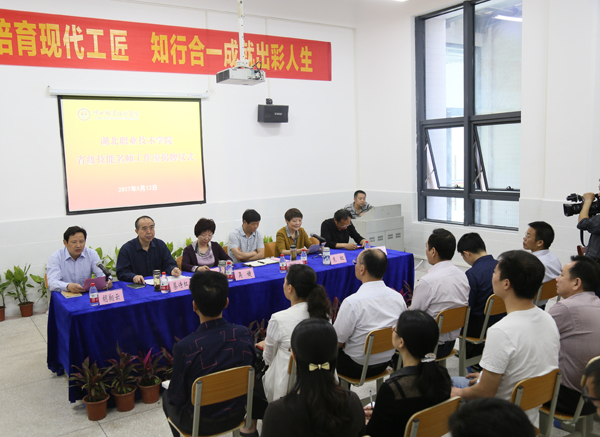 为了进一步贯彻落实国家加快职业教育发展的部署,落实立德树人根本任务,加快培育现代大国工匠,提高人才培养质量,5月12日,湖北省级技能名师工作室揭牌仪式在南校区举行。校长朱虹主持揭牌仪式。