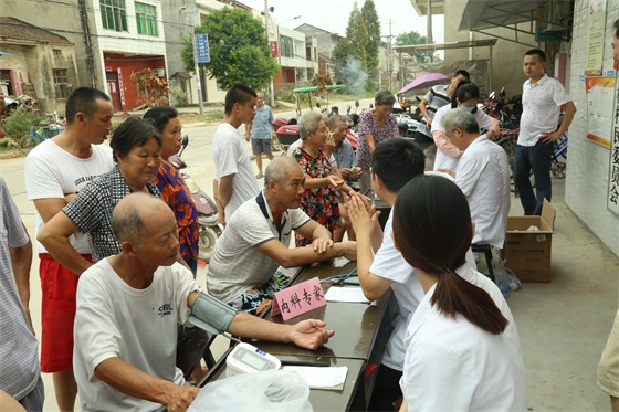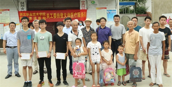 8月11日,在学校关工委常务副主任左德汉、附属惠济医院董事长胡加鹏、教务处处长黄享苟的带领下,学校扶贫义诊医疗服务队一行赴汉川市回龙镇新桥村开展了扶贫义诊、送医药、送爱心活动。活动深受村民们的欢迎,汉川市回龙镇、新桥村的相关负责人参加了相关活动。