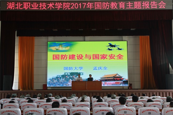 9月11日上午,学校在西区文昌礼堂隆重举行2017年国防教育主题报告会。本次报告会特邀了国防大学孟庆全教授来校作报告。孝感市委宣传部副部长湛卫锋、市委国防教育办公室主任吴险峰,学校党委书记蔡诗红、党委副书记张勇、党委委员、副校长杨立明、党委宣传部负责人曾少武、学工部负责人沈建林、2017年新进教师和近千名新生参加了报告会。会议由学校党委书记蔡诗红主持。