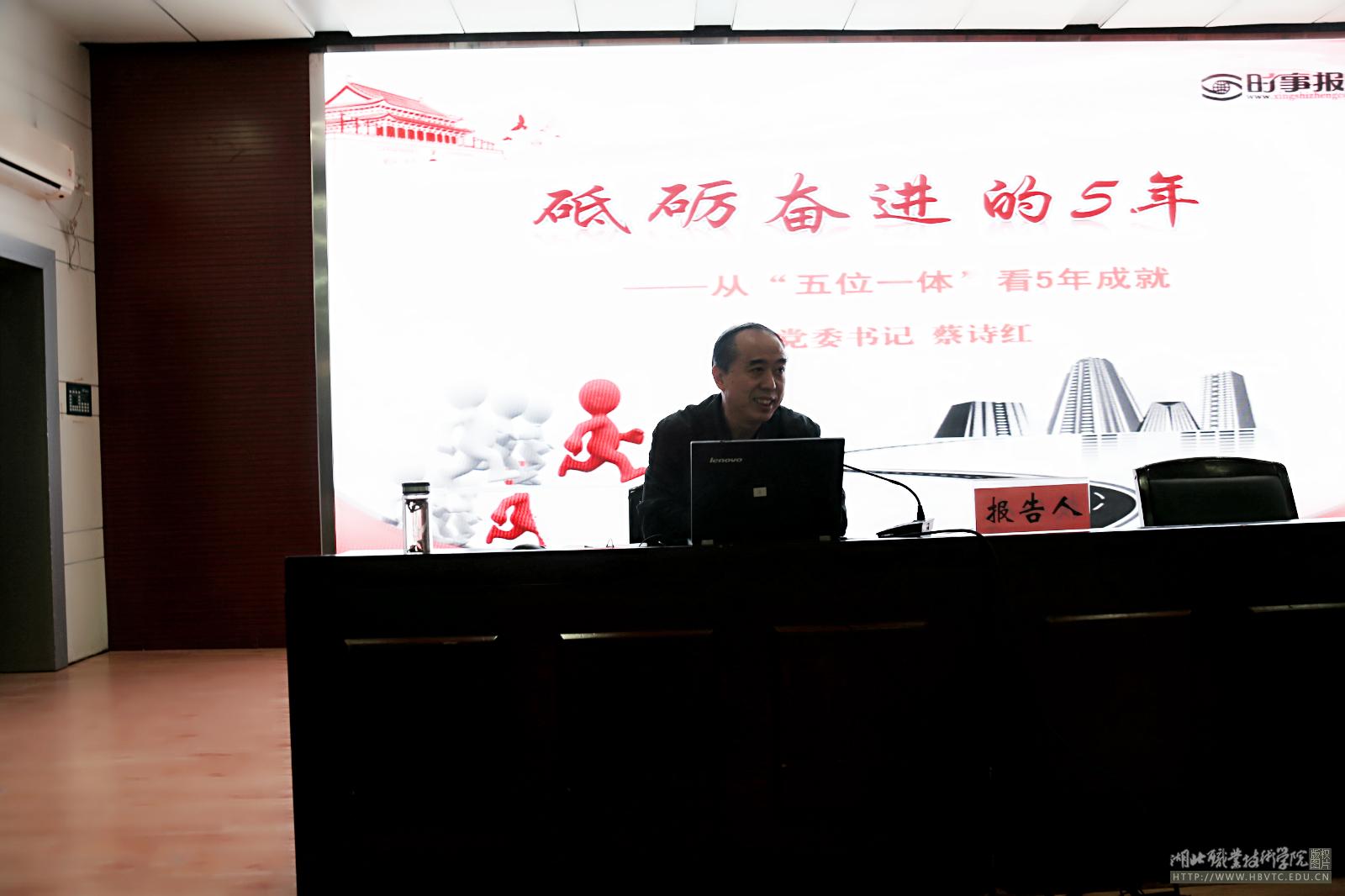 11月15日晚,学校党委书记蔡诗红在文博馆学术报告厅为师生代表作了题为《砥砺奋进的5年——从“五位一体”看5年成就》的报告。学工处、团委、思政课部负责人以及各学院300多名师生聆听了报告,报告会由思政课部负责人刘想元主持。
