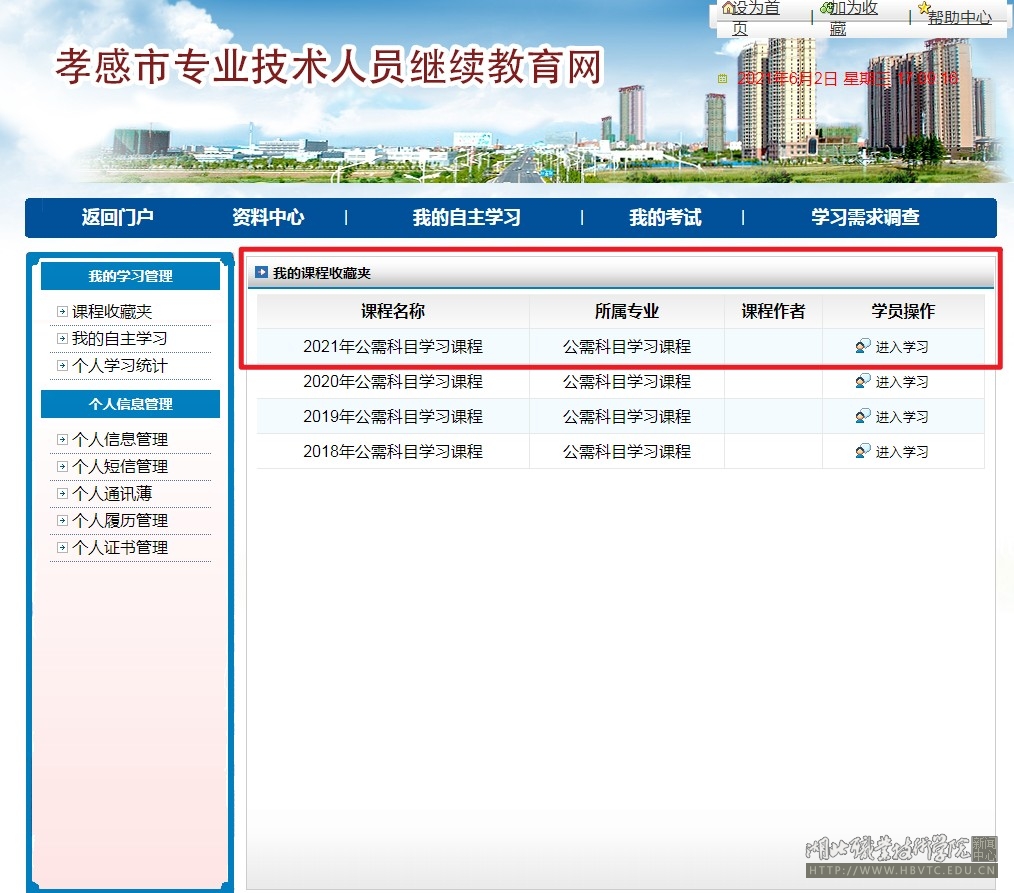 学员登录后就进入在线学习平台,点击“课程收藏夹”。