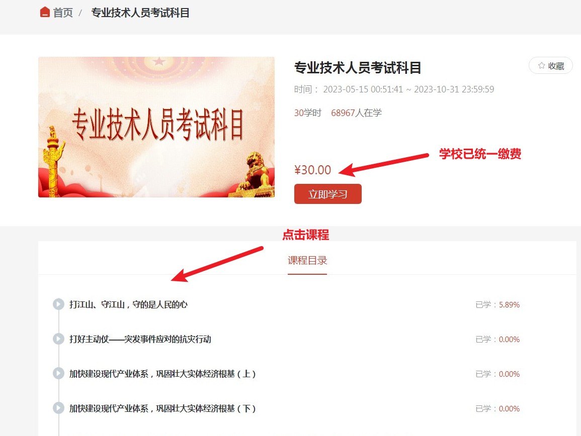 3.选择相应的学习课程进行学习即可(学校已统一完成课程缴费)。