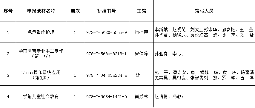 根据国家教材委员会《关于开展第二届全国教材建设奖评选工作的通知》(国教材〔2025〕2号)、省教育厅办公室《第二届全国教材建设奖全国优秀教材(职业教育与继续教育)申报工作预通知》的文件精神和申报条件,经教材委员会专题会议决议,拟推荐以下教材参加评选(排名不分先后),现予以公示,接受广大教职工监督。