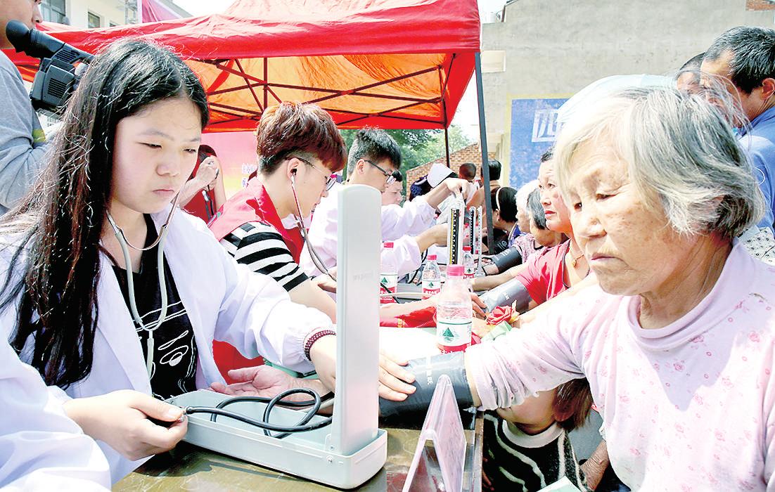 5月25日,九州线上平台的专家教授和医护人员为汉川市回龙镇新桥村村民免费体检。当日,该院在精准扶贫点新桥村开展“科普周·社科专家乡镇行”活动,在义诊的同时,还开展了科普活动。(记者 匡文杰 摄)
