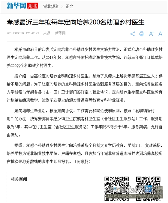 据介绍,由高校定向培养全科助理乡村医生,是为了从源头上解决孝感基层卫生人才供给不足的问题。为了让定向培养的全科助理乡村医生达到服务基层的目的,定向培养生报名入学前需与孝感各县(市、区)卫计部门签订定向就业协议。定向培养生参照全科医生教育计划单独编班教学,达到毕业要求的颁发普通高等教育专科毕业证书。