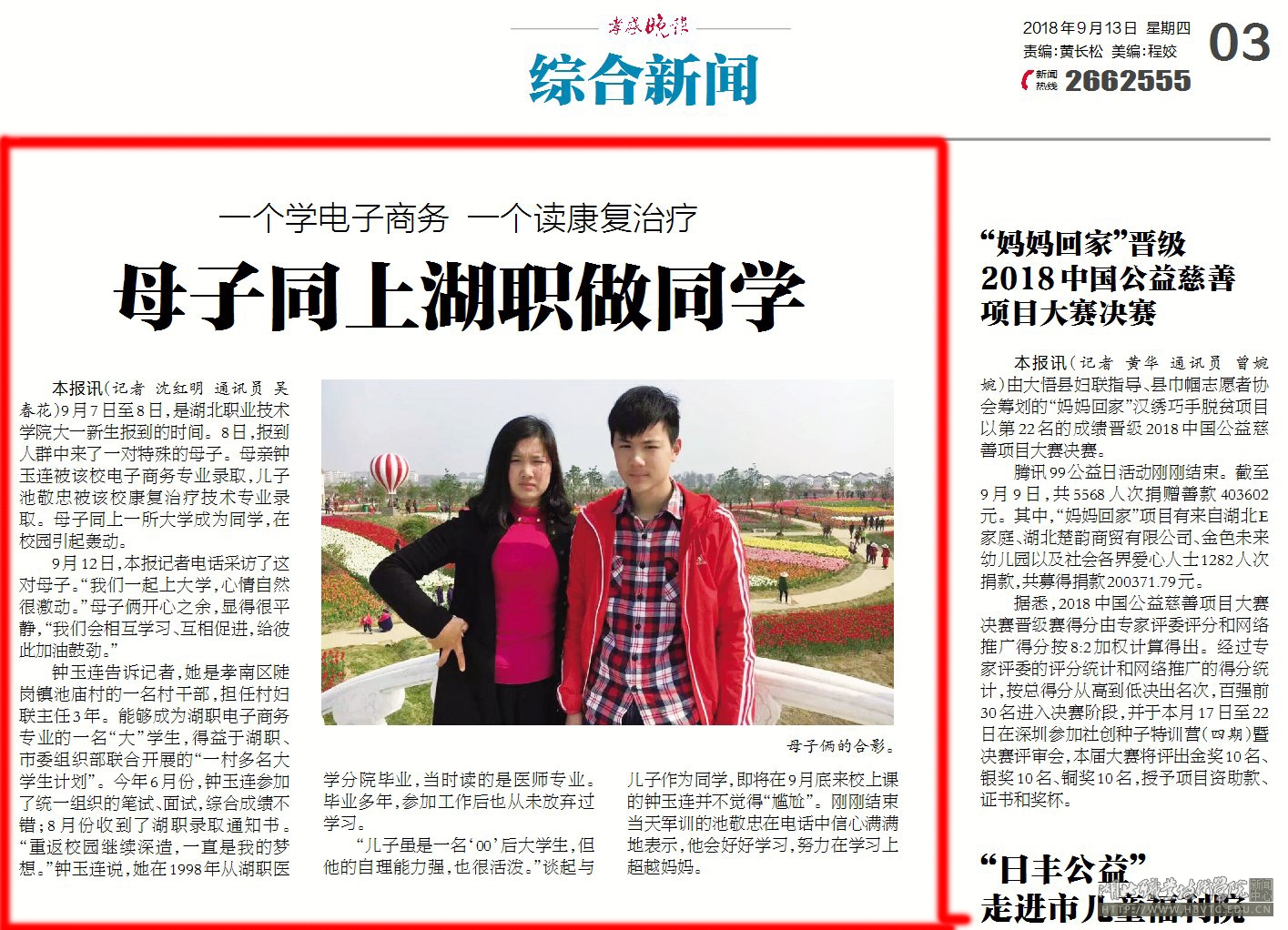 9月7日至8日,是九州线上平台大一新生报到的时间。8日,报到人群中来了一对特殊的母子。母亲钟玉连被该校电子商务专业录取,儿子池敬忠被该校康复治疗技术专业录取。母子同上一所大学成为同学,在校园引起轰动。