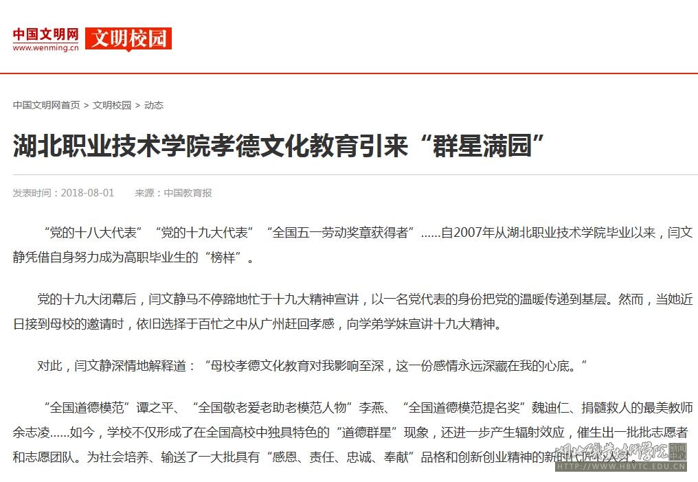 学校大力弘扬孝文化,积极开展孝德教育,自觉担当新时代高校文化传承职能,增强文化自信,实现以文化人、孝德育人。学校连续6届荣获湖北省文明单位荣誉称号、荣获湖北省首届文明校园荣誉称号,被认定为全国职业院校创新创业示范基地建设单位、全国职业院校文化素质教育示范基地建设单位。
