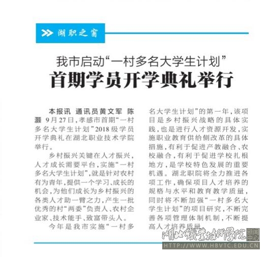 今年是我市实施“一村多名大学生计划”的第一年,该项目是乡村振兴战略的具体实践,也是进行人才资源开发,实施职业教育供给侧的具体措施,有利于促进产教融合、农校融合,有利于促进学校扎根地方,是学校特色发展的重要机遇。湖北职院将全力推进各项工作,确保项目人才培养的规格与水平和教育教学质量,同时将不断加强“一村多名大学生计划”的项目研究,不断完善各项管理体制机制,不断提高人才培养质量。