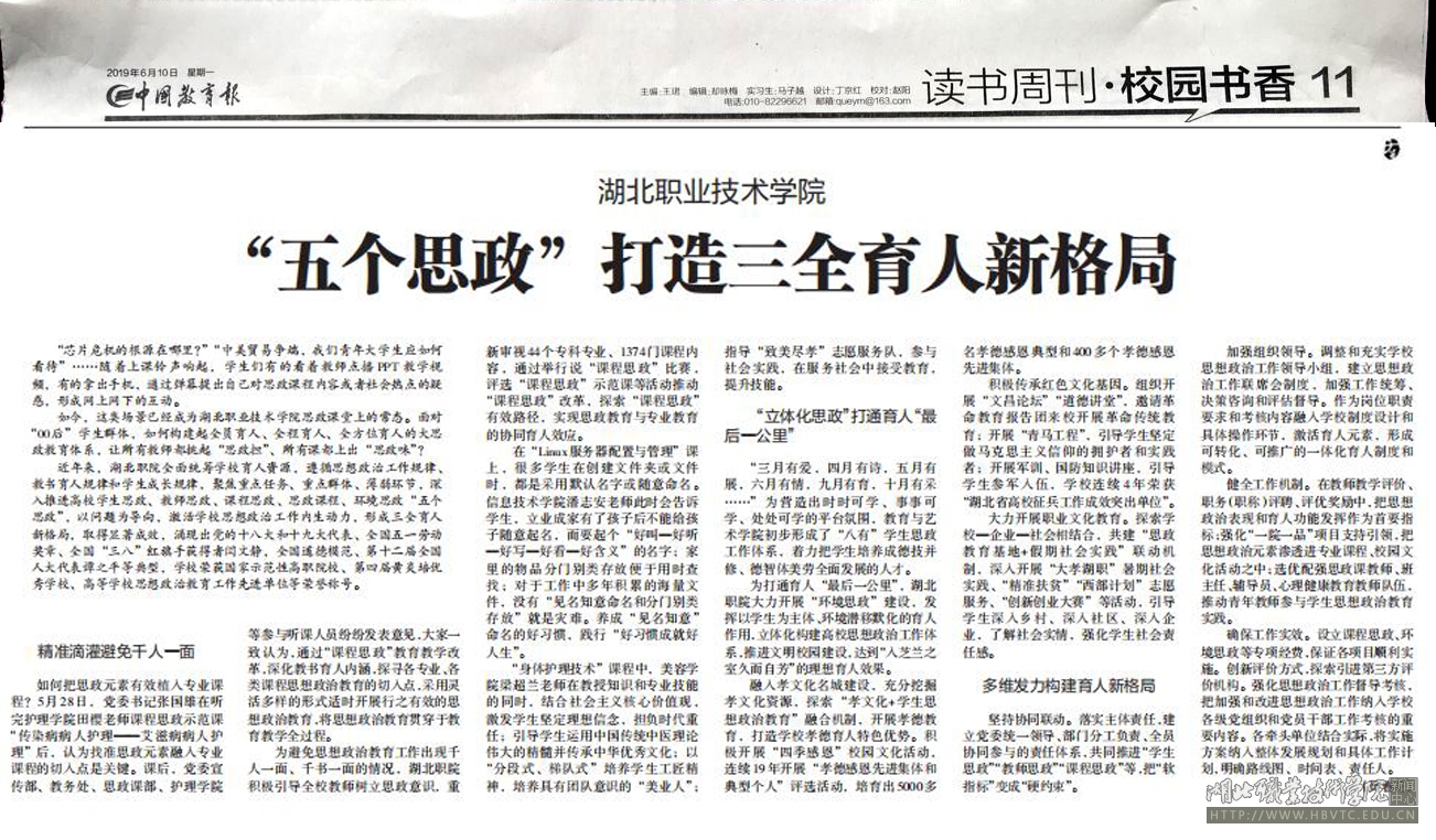 近年来,湖北职院全面统筹学校育人资源,遵循思想政治工作规律、教书育人规律和学生成长规律,聚焦重点任务、重点群体、薄弱环节,深入推进学生思政、教师思政、课程思政、思政课程、环境思政“五个思政”,以问题为导向,激活学校思想政治工作内生动力,形成三全育人新格局,取得显著成效,涌现出十八大、十九大党代表、全国五一劳动奖章、全国“三八”红旗手获得者闫文静,全国道德模范、第十二届全国人大代表谭之平等全国道德典型,学校荣获国家示范性高职院校、第四届黄炎培职业教育优秀学校、高等学校思想政治教育工作先进单位等荣誉称号。