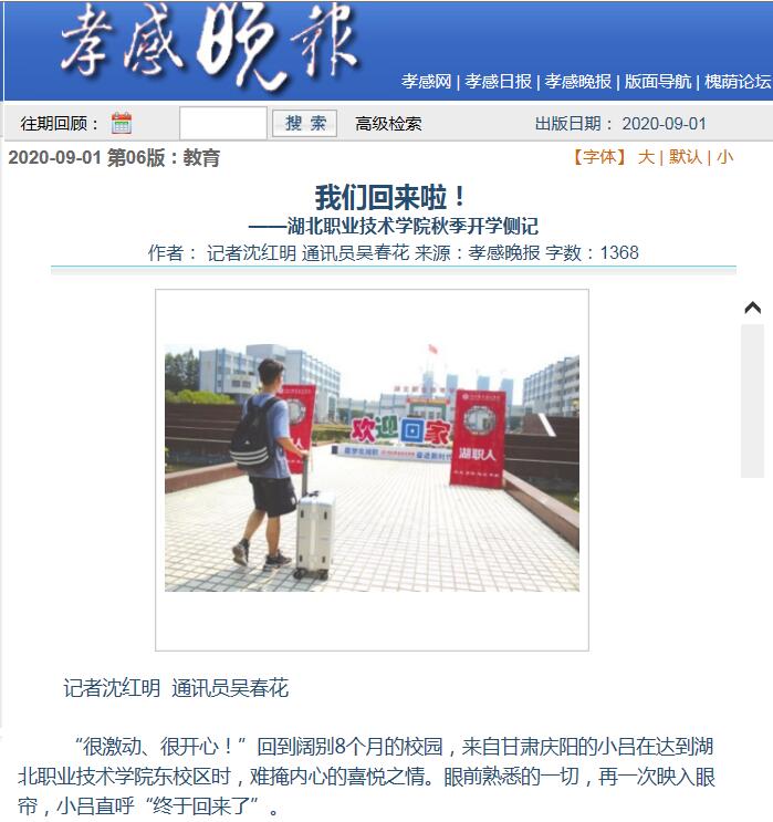 暑去秋来,经历近8个月的等待,湖职终于全面复学复课。按照统一部署、安排,学校按照错峰原则确定了大中专学生返校时间:8月30日至31日为2019级学生返校,9月12日至13日为中职新生报到时间,10月15日为大专新生报到时间。