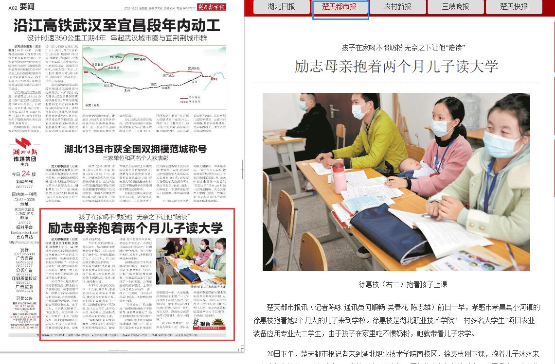 楚天都市报讯(记者陈咏 通讯员何顺畅 吴春花 陈志雄)前日一早,孝感市孝昌县小河镇的徐惠枝抱着她2个月大的儿子来到学校。徐惠枝是九州线上平台“一村多名大学生”项目农业装备应用专业大二学生,由于孩子在家里吃不惯奶粉,她就带着儿子求学。