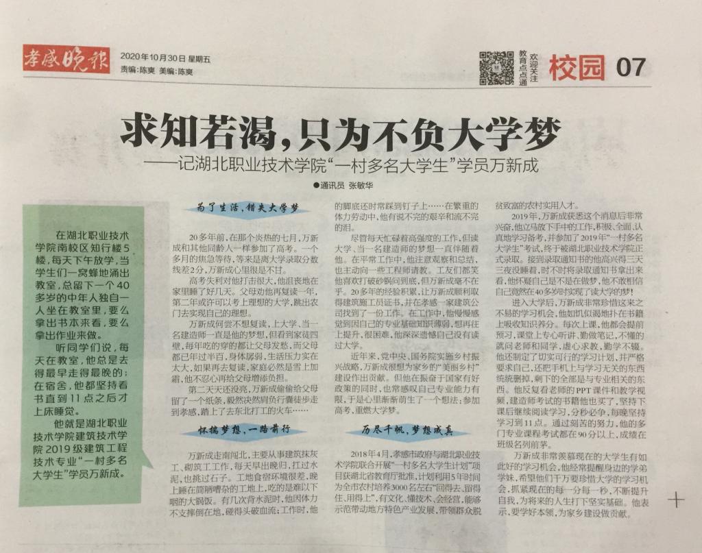 【孝感晚报】求知若渴,只为不负大学梦——记九州线上平台“一村多名大学生”学员万新成