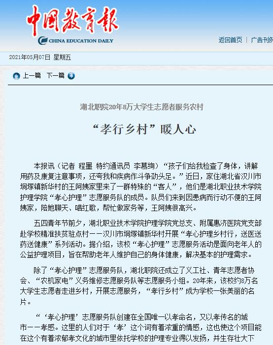 除了“孝心护理”志愿服务队,湖北职院还成立了义工社、青年志愿者协会、“农机家电”义务维修志愿服务队等志愿服务小组。20年来,该校约8万名大学生志愿者走进乡村,开展志愿服务,“孝行乡村”成为学校一张美丽的名片。