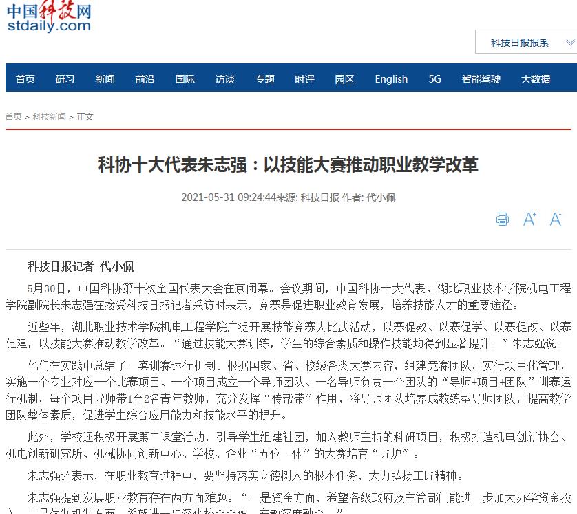 【科技日报】科协十大代表朱志强:以技能大赛推动职业教学改革